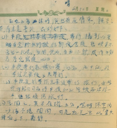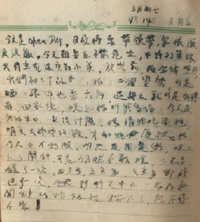 《5月12日星期二,晴》 正在上第二課時突然有通告傳來,報告之下原來是喜訊,茲列如下。 一。本校舉行攝影比賽,有念於我們搬往新校舍後,舊校舍應留一紀念。分開校內,自由兩組,日期為考試完後二日。 二。夲校舉辦象棋比賽,分初、高中組,於考試完畢後第二天舉行。 三。本校定於考試完畢後旅行,由學校向船公司取得半價,加上學校再津貼一半往銀礦灣旅行。同學聞之莫不雀躍三分,登時吵得得不堪聞問,可是在先生的當頭棒喝下、肅靜。 |