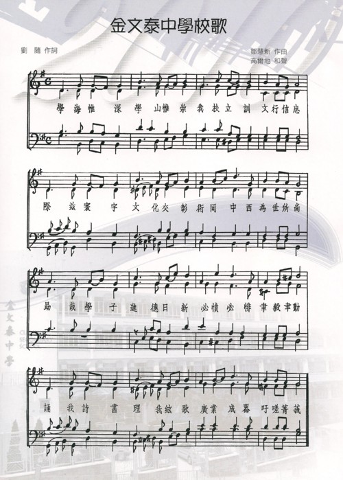 2011 年5 月7 日(星期六),金文泰中學假座香港會議展覽中心舉行85 週年校慶晚宴,筵開70 席,新知舊雨,濟濟一堂;衣香鬢影,觥籌交錯。我屆57畢業同學也有24人參加,談往事、論今朝,好不高興。 席間,大家發覺校歌有一句一曲兩唱,不禁竊竊私語。回想起1951年,官立漢文中學易名為金文泰中學,始有校歌。我屆57校友剛好在51年入讀初中一,校歌一直唱【我校立訓】,直至高中畢業。緣何現今有校友唱【吾校立訓】? |